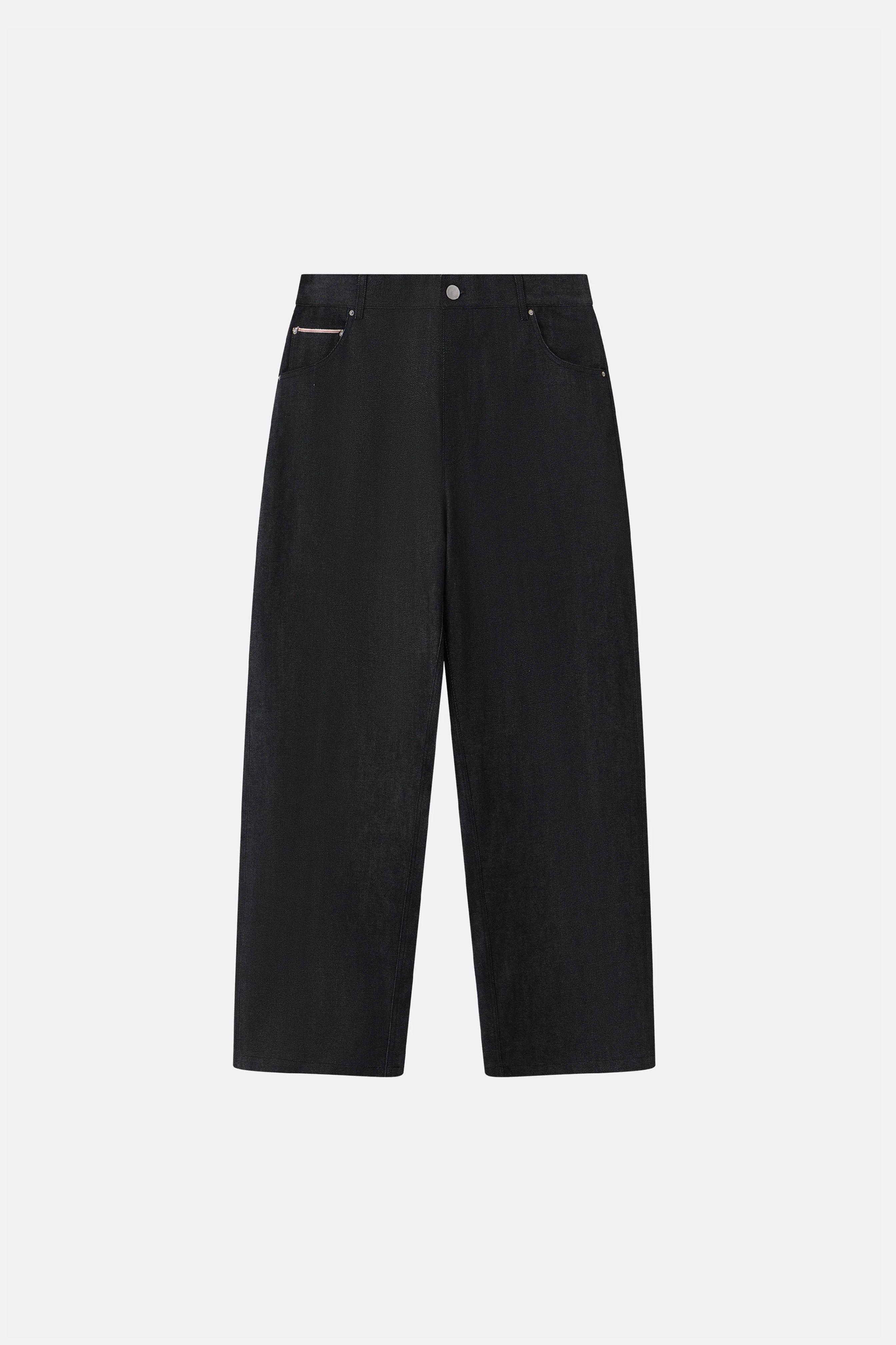 Selvedge Denim Jeans 'Black' er fremstillet i selvedge-denim, 13,8 oz. Selvedge Denim Jeans 'Black' har en struktureret baggy pasform med mid-waist, fem klassiske lommer og kontrastsyninger. Den synlige selvedge-kant ved oplægningen tilføjer en diskret, men eksklusiv detalje.